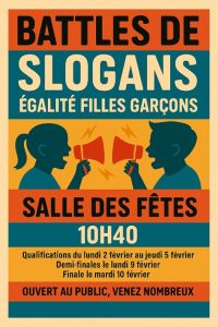 Démarche : Le projet a été mené sur la période janvier-février 2026 avec l’appui des professeurs principaux, du CVC et des enseignants membres du jury. Chaque classe a travaillé en heure de vie de classe pour inventer un slogan, puis créer une courte saynète à partir de ce slogan. Deux élèves référents, une fille et un garçon, ont représenté leur classe lors de duels interclasses organisés pendant les récréations. Les prestations ont été filmées par les élèves du CVC et évaluées par un jury de trois professeurs. Le slogan gagnant est édité sur des règles distribuées à l’ensemble des collégiens pour qu’ils puissent conserver un souvenir symbolique et utile de leur engagement collectif pour l’égalité. Les slogans de tous les élèves ont ensuite été mis en valeur par l’exposition de l’arbre de l’égalité à l’entrée du collège. L’action vise à sensibiliser les élèves et à déconstruire ensemble les stéréotypes, tout en promouvant un esprit d’équipe et d’égalité au quotidien. Cette idée a germé lors d’une journée banalisée (travaux de groupes proposés par la Directrice du collège).