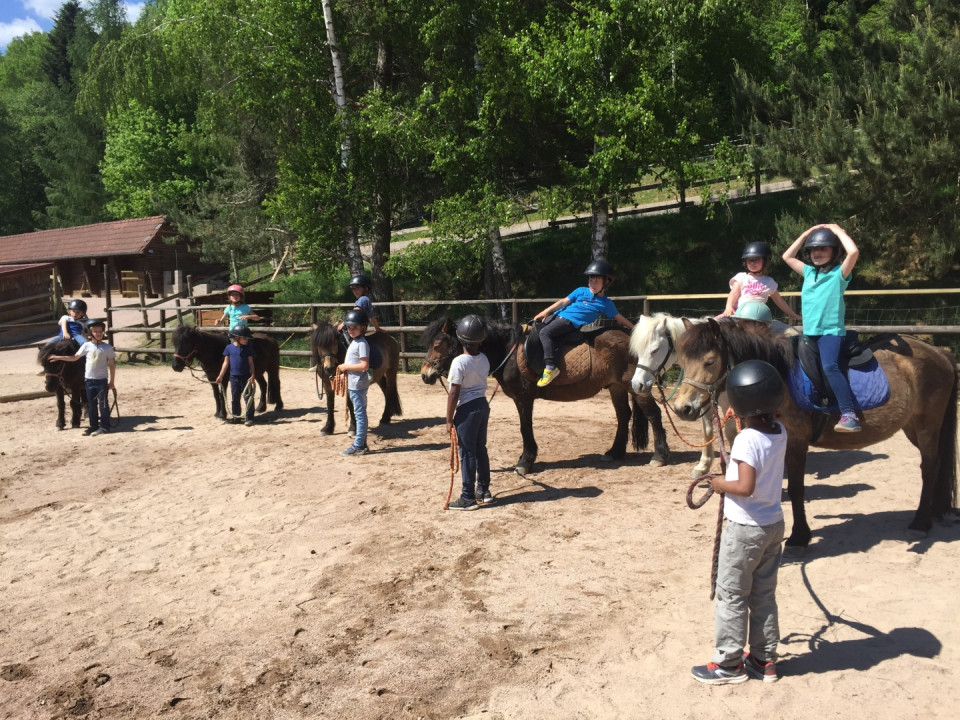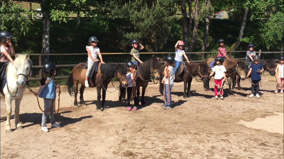 Et voilà, maintenant place à la leçon d’équitation. On monte sur des grands poneys : Réglisse, Chocolat, Noisette et compagnie. Ils sont très gentils mais ont souvent envie de grignoter, il faut bien les guider.